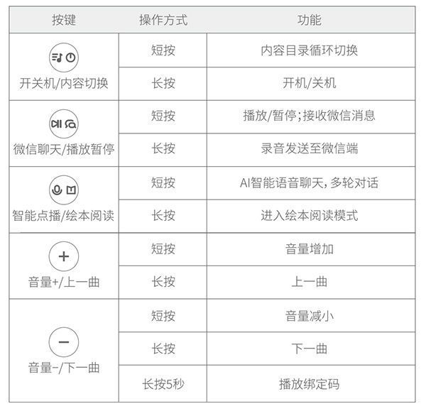 * 短按“智能点播”键可进行连续多轮语音互动,可以点播歌曲、故事、百科问答、查询天气、计算、翻译、闲聊等。
